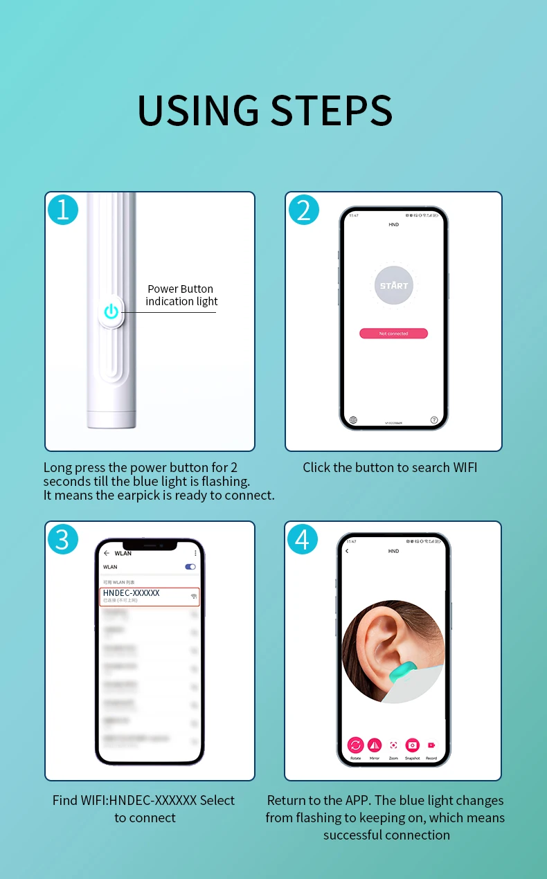 ?Fácil de usar e ampla compatibilidade. Digitalize o código QR no manual, faça o download e instale o aplicativo no seu dispositivo, pressione e segure o botão de energia na parte superior do dispositivo para ligar a haste de limpeza da orelha e, em seguida, conecte WiFi (Nome: HNDEC-xxxx) com o seu dispositivo. O aplicativo funciona com todos os smartphones Android/tablet e IOS iPhone / iPad.
